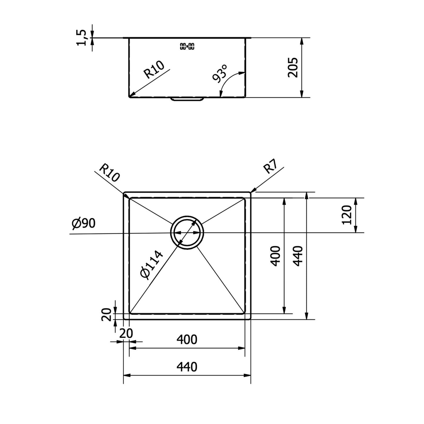 Sink Dimensions (mm): L440 x W440 x H205